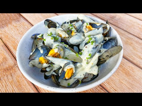 Étape 7 : Verser la sauce roquefort sur les moules. Bon appétit !