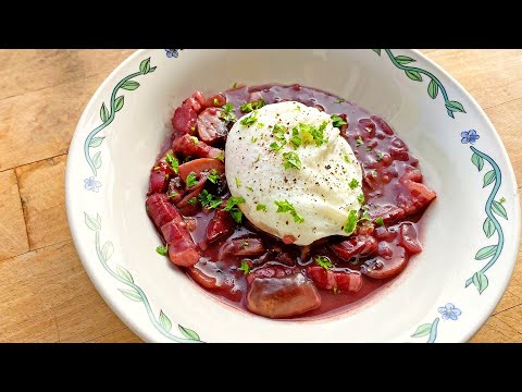 Et pourtant, c’est un délice qui regroupe tous les ingrédients que j’aime : des œufs, du lard, des champignons, de l’ail, des croûtons de pain, et du vin rouge !