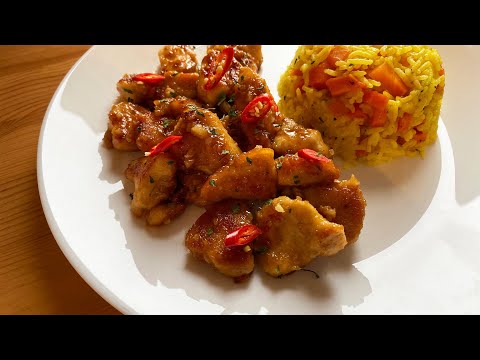 3. Dans une poêle chaude avec l'huile, faire revenir le poulet. J'utilise une écumoire pour prendre le poulet et enlever l’excédent de farine.