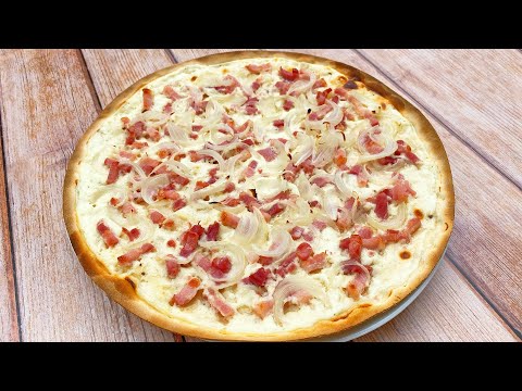 Cette recette vous guide à travers les étapes pour réaliser une délicieuse tarte flambée croustillante avec des lardons fumés et des oignons émincés.